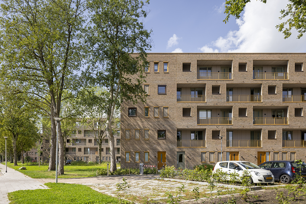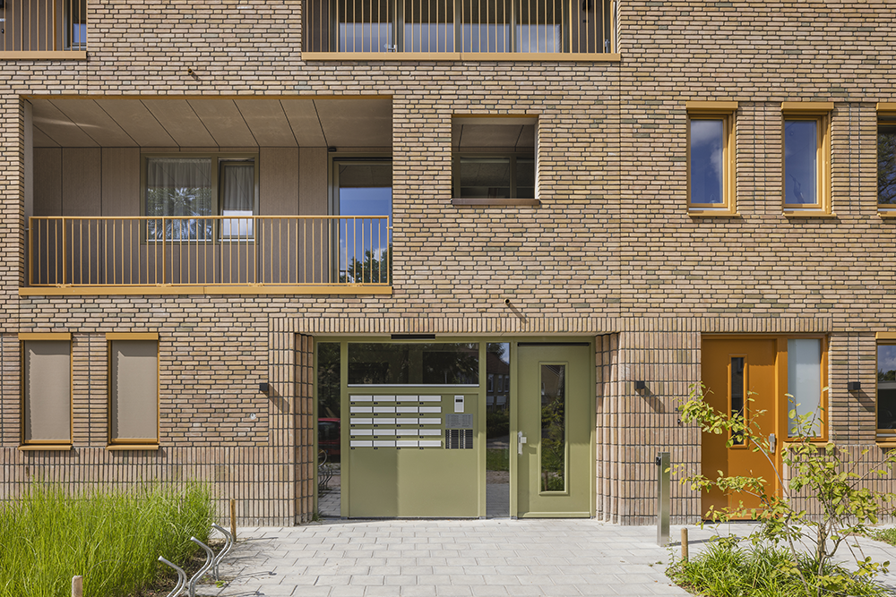 Appartementen op de begane grond hebben hun eigen voordeur aan de straatzijde, wat zorgt voor levendigheid en sociale veiligheid. Elk gebouw kreeg een eigen steensoort en kleuraccent in aardse tinten. De ramen zijn in een diagonaal patroon geplaatst, balkons hangen luchtig aan de gevel, en het metselwerk heeft bijzondere patronen en details.