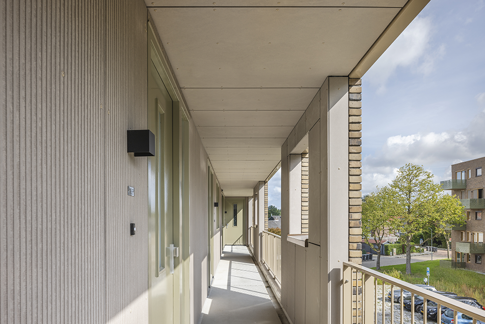 De oorspronkelijke portiekflats hadden een belangrijke kwaliteit: bewoners hadden hun eigen entree met opgang, en verkeersruimtes waren nauwelijks zichtbaar in het straatbeeld. Die kwaliteit is in de nieuwe galerijflats zorgvuldig doorvertaald. De galerijen verdwijnen visueel bijna in de gevels: metselwerk loopt deels vóór de galerijen langs en de galerijlengte is bewust beperkt. Zo ogen de gebouwen aan alle zijden als volwaardige woonblokken.